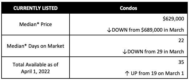 - There are 35 active condos listed for sale as of April 1 as compared to 19 on March 1.