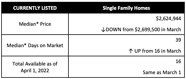 - The YTD median sales price for single-family homes through the first quarter of 2022 is $1,225,000 which is up approximately 6% over 2021.