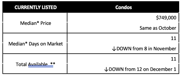 - There are 11 active condos listed for sale as of December as compared to 12 on November 1. This is a HISTORIC LOW.