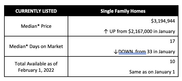 - There are 10 active single-family homes listed for sale on February 1 which is the same as last month.