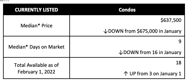 - There are 18 active condos listed for sale as of February1 as compared to 3 on January 1.