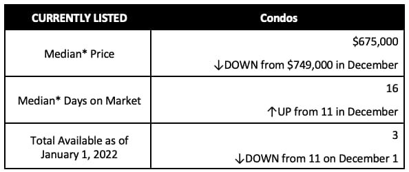 - There are 3 active condos listed for sale as of January 1 as compared to 11 on December 1. This is a HISTORIC LOW.