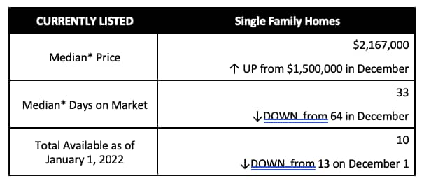 - There are 10 active single-family homes listed for sale on January 1 which is 3 less than last month.