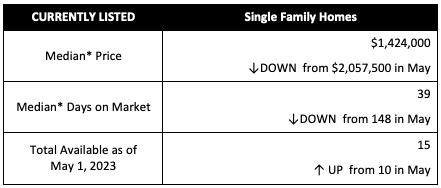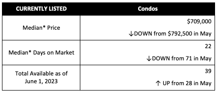 Inventory continues to be low for both condos (39) and single-family homes (15). That being said, these are the highest monthly inventory levels so far in 2023.