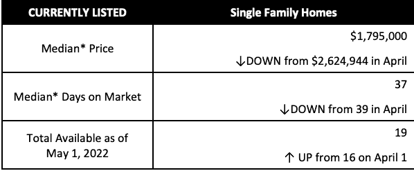 - The YTD median sales price for single-family homes through April 2022 is $1,415,000 which is up approximately 23% over 2021.
