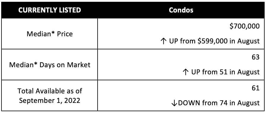 - There are 61 active condos listed for sale as of September 1 compared to 74 last month. There were only 3 condos listed in January 2022. While inventory is up from earlier this year, it is down from pre-COVID levels (September 2019 there were 129 condos listed for sale).