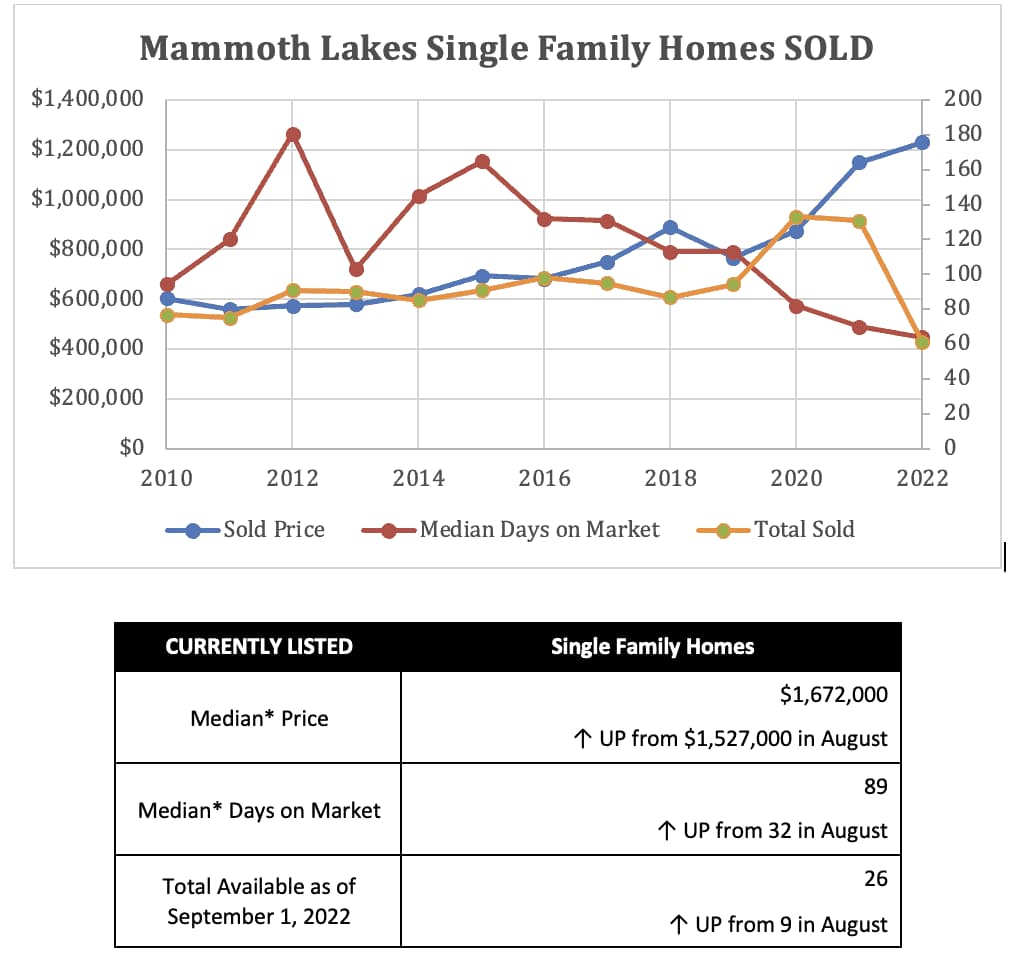 The Mammoth Lakes real estate market continues to stabilize as we enter September. After a crazy couple of years, locally it is no longer a sellers’ market and things are more balanced. In a balanced market buyers tend to place reasonable offers on homes and sellers tend to accept them. In most cases, homes remain on the market for a moderate amount of time — neither lagging for months nor getting snapped up in mere hours or days. Home prices remain stable or grow at a steady pace. Although pricing and days on market are more stable locally, the YTD median sold price for both condos and single-family homes is up. Interestingly, September 2022 inventory is approximately half of what it was September 2019 (pre-COVID).