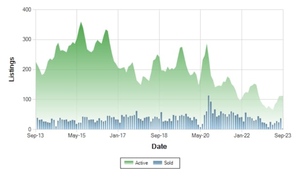 The chart below shows inventory levels for 2013 – 2023 for both condos and single-family homes combined.