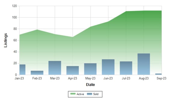 As of September 1, 2023, the Mammoth Lakes real estate market continues to move towards a more balanced market. The biggest driving force in this shift is slightly increasing inventory. While inventory is still lower than the 10-year average, the number of properties for sale continues to increase month over month in 2023. The chart below shows inventory levels for the last 8 months for condos and single-family homes combined (green).