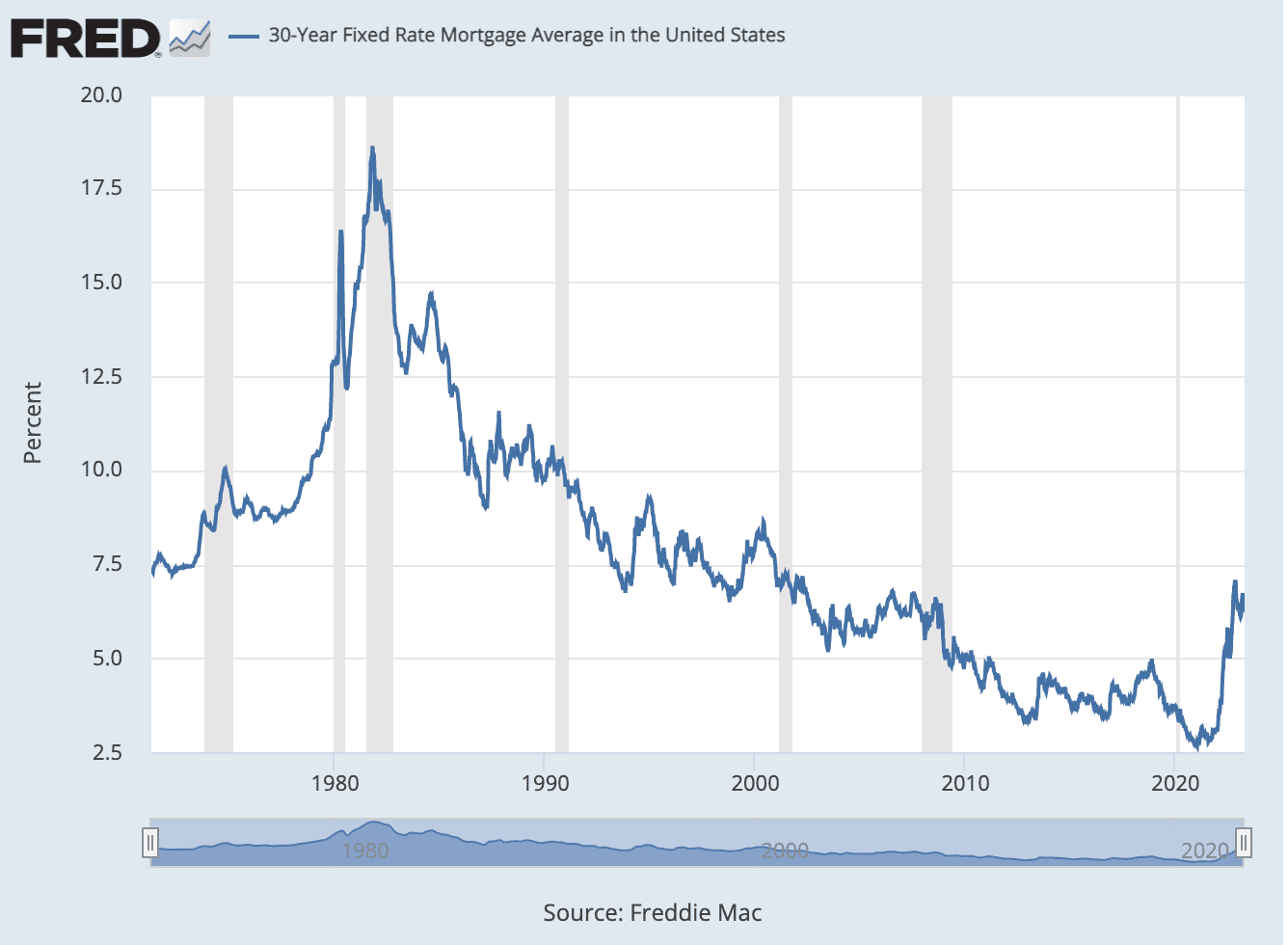 The first time 30-year mortgage rates had a number 5 as a first digit on a regular basis was in 2003. But even from then through late 2008, rates were as likely to be in the mid to high 6% range as they were in the mid 5% range. Mortgage rates only came down below 5.5% on a regular basis due to two major events: the 2008 financial crisis and the COVID-19 pandemic.